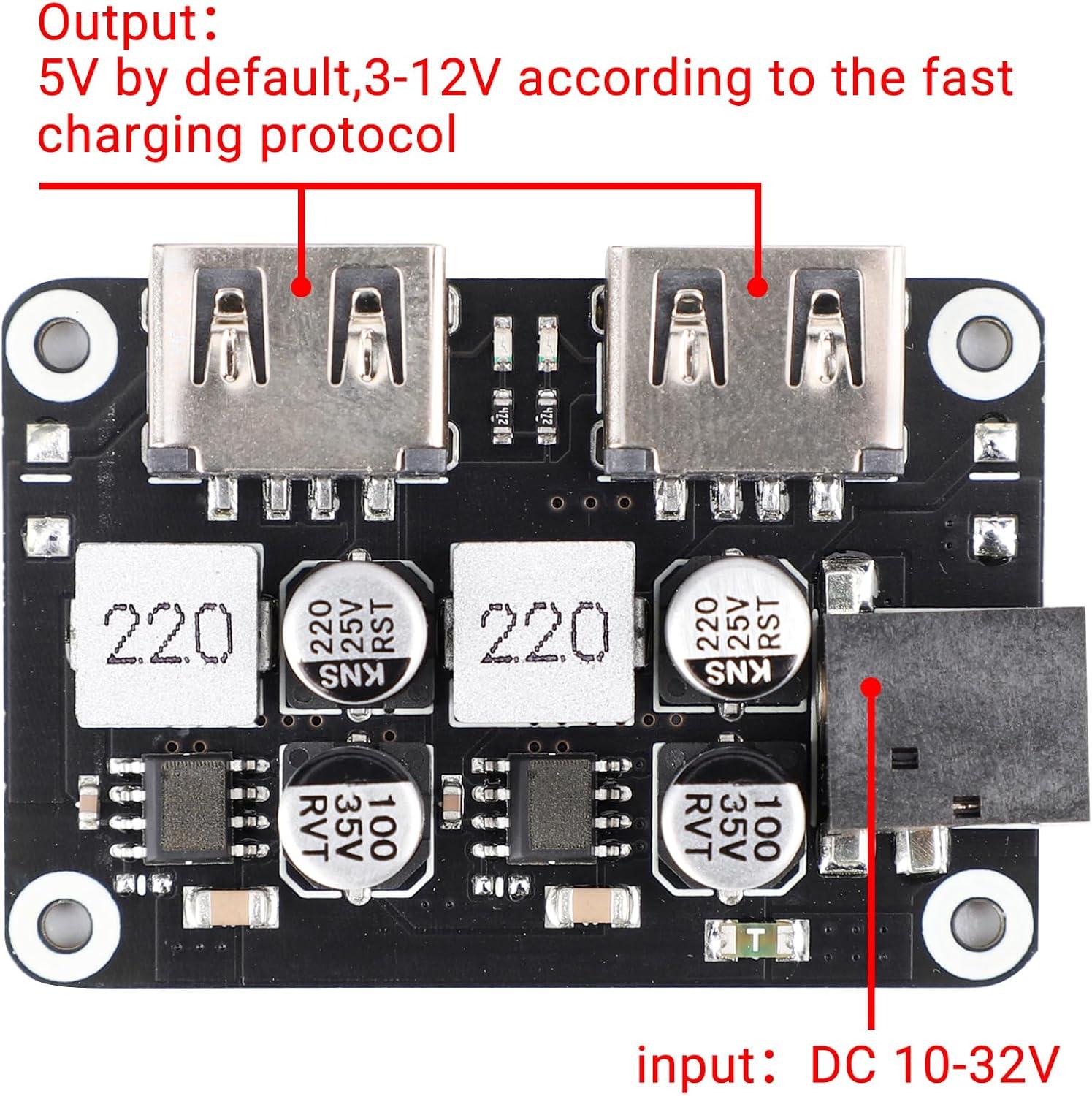 PARAMETER — Input voltage DC 10-32V; Output voltage default 5V, after triggering quick charging, it will automatically adjusted at 3-12V.