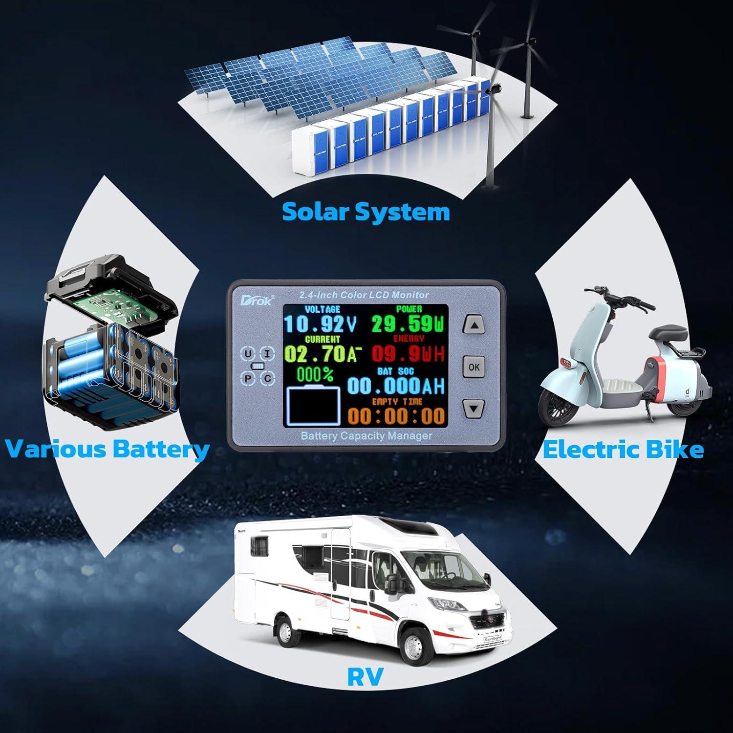 APPLICATION — can be used as battery charge discharge tester meter coulometer for automotive and car battery; as battery capacity monitor for solar panel; as voltage meter, ampere meter, power meter for RV Boat, etc. Mounting with base for more stability.