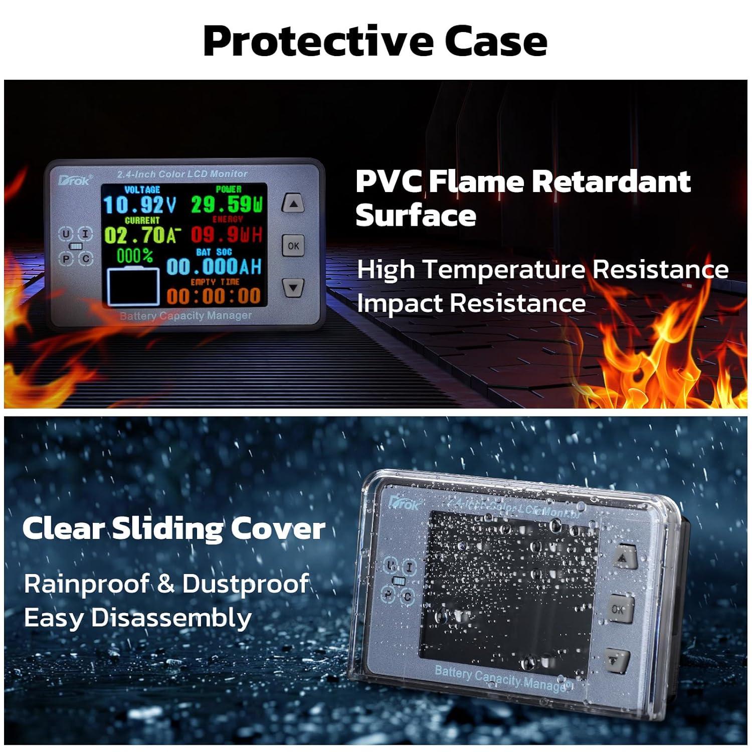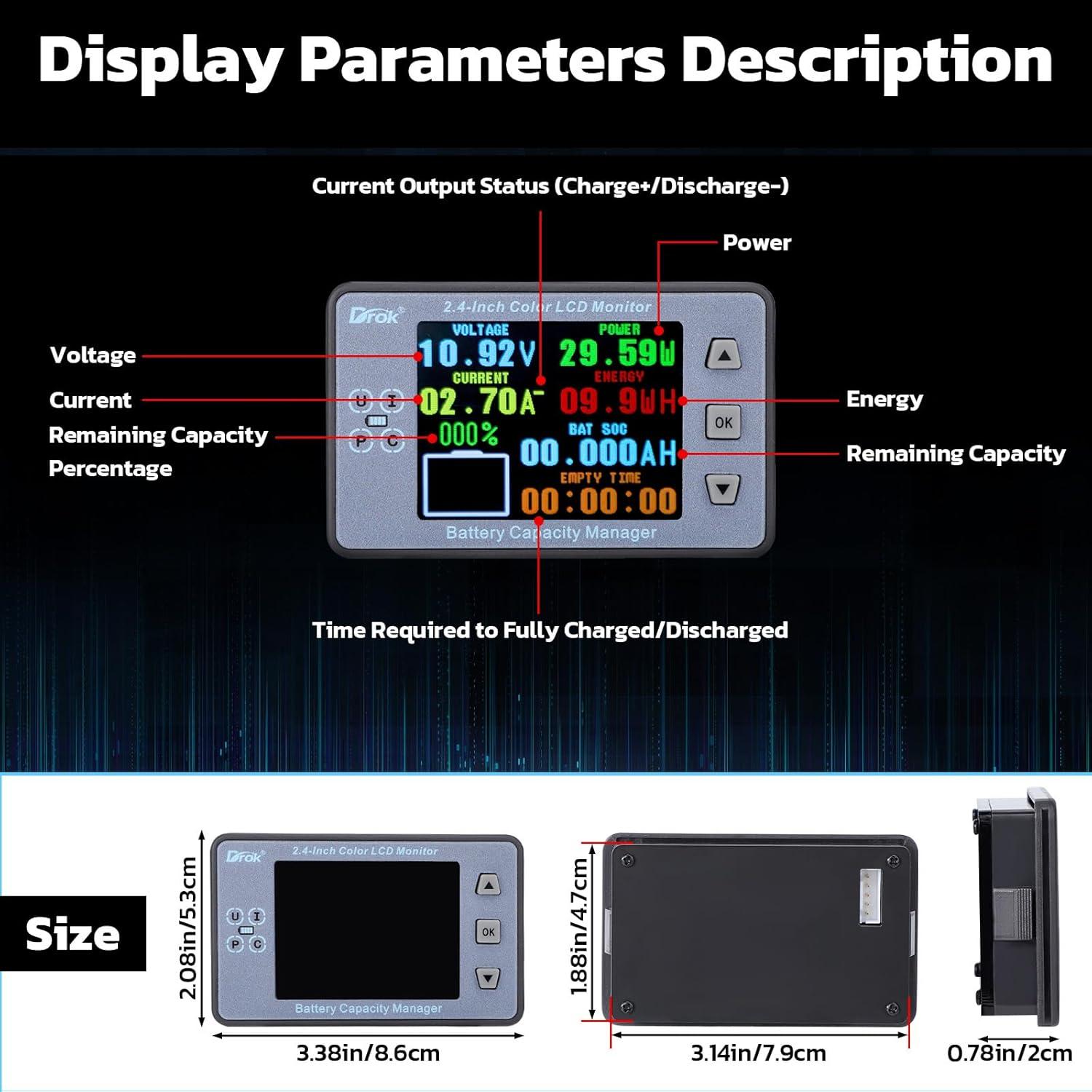 DROK Digital Multimeter, DC 8-100V 100A Battery Monitor 12V 24V 36V 48V 60V Volt Amp Watt Meter, Big Color Screen LCD Display Capacity Time Power Voltmeter Ampmeter for RV Solar Panel Battery Charge(100A/with Base)