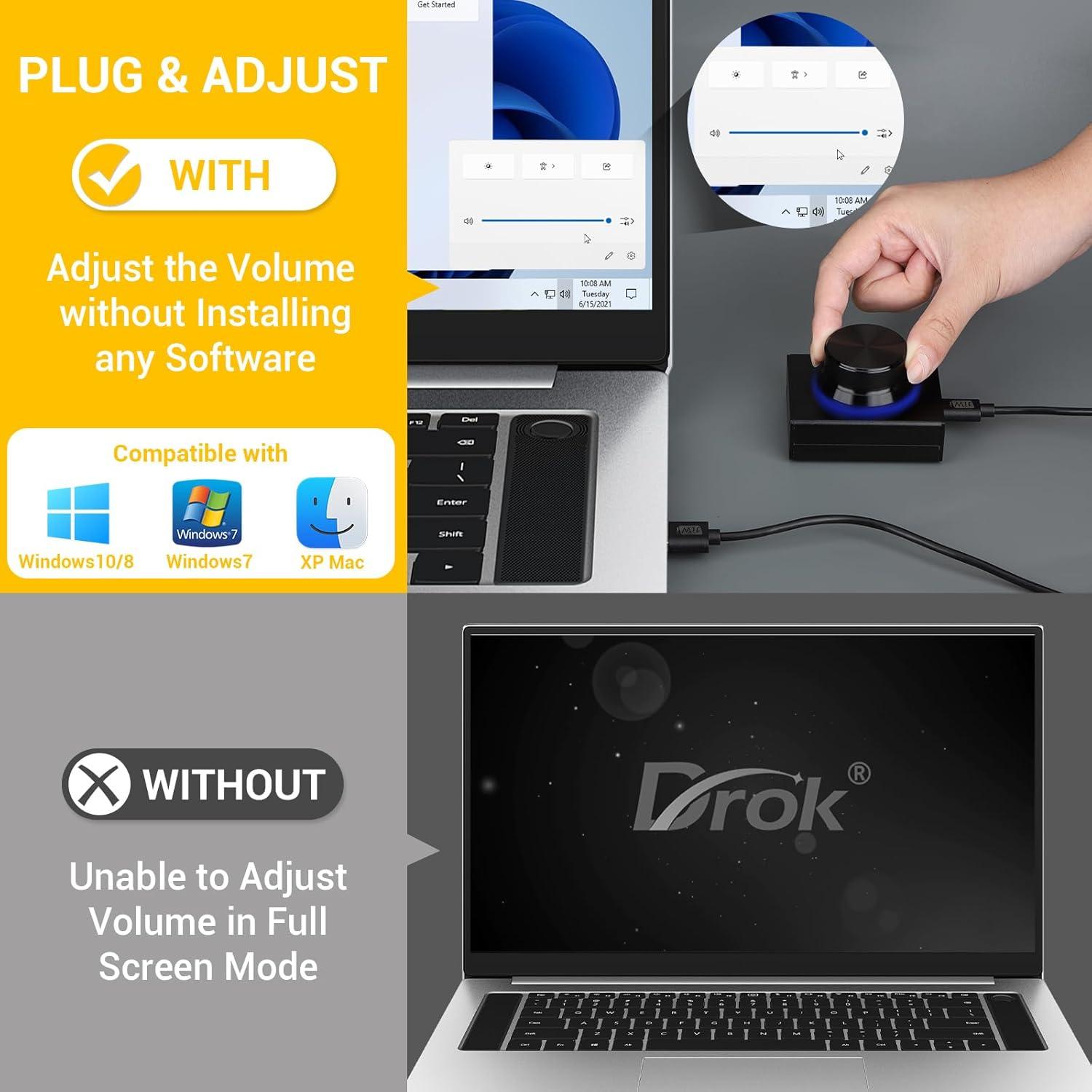 【Strong Construction】 DROK USB volume control is made of metal shell and ALPS rotary shaft, equipped with breathing light and come with USB cable. With 1 key mute function, when you are listening to music, just press the knob, it will stop at once and back to music when you press again.